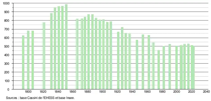 L'évolution du nombre d'habitants est connue à travers les recensements de la population effectués dans la commune depuis 1793. Pour les communes de moins de 10 000 habitants, une enquête de recensement portant sur toute la population est réalisée tous les cinq ans, les populations de référence des années intermédiaires étant quant à elles estimées par interpolation ou extrapolation[21]. Pour la commune, le premier recensement exhaustif entrant dans le cadre du nouveau dispositif a été réalisé en 2005[22].