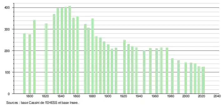 L'évolution du nombre d'habitants est connue à travers les recensements de la population effectués dans la commune depuis 1793. Pour les communes de moins de 10 000 habitants, une enquête de recensement portant sur toute la population est réalisée tous les cinq ans, les populations de référence des années intermédiaires étant quant à elles estimées par interpolation ou extrapolation[17]. Pour la commune, le premier recensement exhaustif entrant dans le cadre du nouveau dispositif a été réalisé en 2006[18].