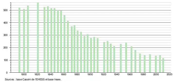 - ↑ Dans le tableau des recensements et le graphique, par convention dans Wikipédia, le principe a été retenu, pour les populations légales postérieures à 1999 de n’afficher dans le tableau des recensements et le graphique que les populations correspondant à l'année 2006, première population légale publiée calculée conformément aux concepts définis dans le décret no 2003-485 du 5 juin 2003, et les années correspondant à une enquête exhaustive de recensement pour les communes de moins de 10 000 habitants, ainsi que la dernière population légale publiée par l’Insee.