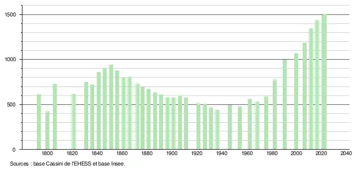 L'évolution du nombre d'habitants est connue à travers les recensements de la population effectués dans la commune depuis 1793. Pour les communes de moins de 10 000 habitants, une enquête de recensement portant sur toute la population est réalisée tous les cinq ans, les populations de référence des années intermédiaires étant quant à elles estimées par interpolation ou extrapolation[17]. Pour la commune, le premier recensement exhaustif entrant dans le cadre du nouveau dispositif a été réalisé en 2006[18].