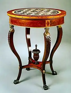 Dans certains cas, elle se permute en petite table reposant généralement sur un support central se terminant par trois doigts reposant au sol à partir du style Empire [1]. Ce type de meuble utilisé dans l'antiquité comme en témoignent les guéridons trouvés à Herculanum et Pompéi est réapparu en France vers le milieu du XVIIe siècle, puis plus tard dans le style Louis XVI et les suivants. La table « bouillotte » est un guéridon de forme ronde à quatre pieds, souvent recouverte de marbre, cerclé avec une galerie en laiton ajouré et comprenant de petits tiroirs et des tirettes en ceinture.