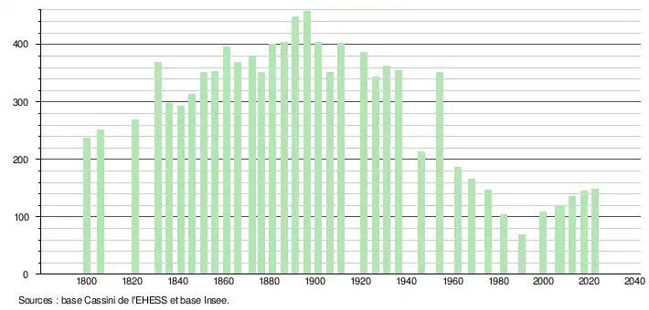 L'évolution du nombre d'habitants est connue à travers les recensements de la population effectués dans la commune depuis 1800. Pour les communes de moins de 10 000 habitants, une enquête de recensement portant sur toute la population est réalisée tous les cinq ans, les populations de référence des années intermédiaires étant quant à elles estimées par interpolation ou extrapolation[7]. Pour la commune, le premier recensement exhaustif entrant dans le cadre du nouveau dispositif a été réalisé en 2007[8].