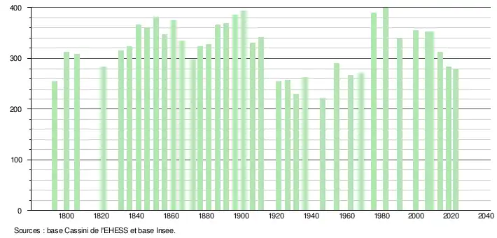 L'évolution du nombre d'habitants est connue à travers les recensements de la population effectués dans la commune depuis 1793. Pour les communes de moins de 10 000 habitants, une enquête de recensement portant sur toute la population est réalisée tous les cinq ans, les populations de référence des années intermédiaires étant quant à elles estimées par interpolation ou extrapolation[18]. Pour la commune, le premier recensement exhaustif entrant dans le cadre du nouveau dispositif a été réalisé en 2008[19].