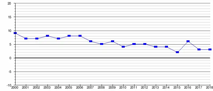 des dépenses d'équipement[Note 18] pour une valeur de 3 250 000€ (72%), soit 279€ par habitant, ratio inférieur de 14% à la valeur moyenne pour les communes de la même strate (324€ par habitant). Pour la période allant de 2014 à 2018, ce ratio augmente de façon continue de 89€ à 278€ par habitant;