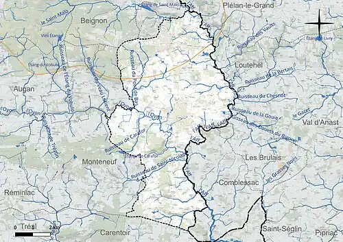 La commune est située dans le bassin Loire-Bretagne. Elle est drainée par l'Aff, l'Oyon, le Saint-Malo, le ruisseau de Saint-nicolas[1], le ruisseau de Carafor[2], le ruisseau de la Fléchaie[3], le ruisseau de la Gouie[4], le ruisseau du Minerai de coëtquidan[5], le ruisseau du Pont de bas[6], le Vau Marqué[7] et divers autres petits cours d'eau[8],[Carte 1].