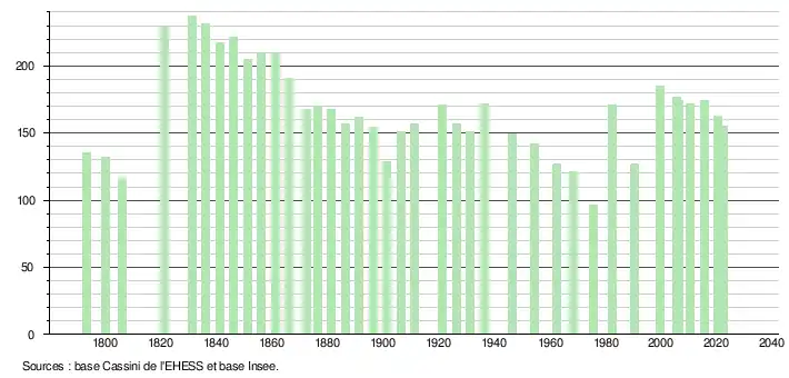 L'évolution du nombre d'habitants est connue à travers les recensements de la population effectués dans la commune depuis 1793. Pour les communes de moins de 10 000 habitants, une enquête de recensement portant sur toute la population est réalisée tous les cinq ans, les populations de référence des années intermédiaires étant quant à elles estimées par interpolation ou extrapolation[22]. Pour la commune, le premier recensement exhaustif entrant dans le cadre du nouveau dispositif a été réalisé en 2005[23].