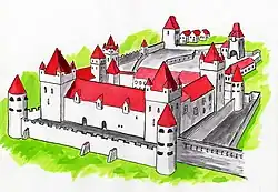 Les efforts accélérèrent en 1541 après que la ville de Buda fut prise par Soliman. Désormais privé du contrôle du Danube, Ferdinand s'empressa de construire une nouvelle ligne s'appuyant cette fois sur le massif transdanubien, seule frontière naturelle restante face aux Ottomans[81]. Les églises et manoirs locaux servirent souvent de fortifications improvisées, renforcées par des palissades en bois et des ouvrages en terre[82]. Les forteresses existantes furent modernisées et de nouvelles furent construites, sous la supervision d'architectes italiens venus implémenter les nouvelles doctrines de fortifications en Hongrie[83]. Le tracé à l'italienne, qui avait fait ses preuves en Italie, devint la norme sur la frontière et remplaça peu à peu le réseau castral médiéval hongrois.