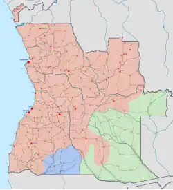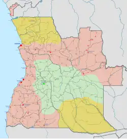Résultats des élections de 1992: en rouge, les régions où la population a majoritairement voté pour le MPLA, en vert, pour l'UNITA, et en jaune pour le FNLA.