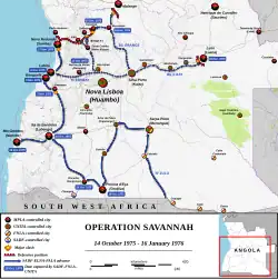 Cependant, dès , l’Afrique du Sud, inquiète devant la progression soudaine du MPLA, et souhaitant protéger les installations menacées du fleuve Kumene qui alimentent la Namibie en électricité, décide d’envoyer des commandos puis de dépêcher son armée. L'UNITA et le FNLA s'allient avec l'Afrique du Sud, qui leur livre un grand nombre d'armes et de munitions. Les forces armées du Zaïre franchissent également la frontière. En octobre, l’opération « Savannah » (en) est lancée avec le soutien des États-Unis, dont l'objectif consiste à reprendre Luanda avant le . L'entrée de l'Afrique du Sud dans la guerre renverse complètement la situation en quelques semaines, ses troupes et ses alliés s'avancent rapidement et profondément[6]. Le 10 novembre, les troupes du FNLA, du Zaïre, et quelques mercenaires sont stoppés à la bataille de Kifangondo, à seulement 22 kilomètres de la capitale.