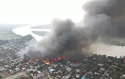 En , les Nations unies estiment que depuis le coup d'État de , 17,6 millions de personnes en Birmanie ont besoin d'une aide humanitaire, tandis que 1,6 million sont déplacées à l'intérieur du pays et que plus de 55 000 bâtiments civils ont été détruits[37]. Le Bureau de la coordination des affaires humanitaires des Nations Unies (UNOCHA) déclare que plus de 40 000 personnes ont fui vers les pays voisins, dont le Bangladesh, l'Inde et la Thaïlande[38].