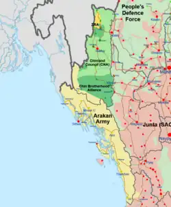 En , la Tatmadaw (armée birmane) contrôle moins de 40% du pays, tout en affirmant contrôler environ les deux tiers des 330 cantons du pays[39],[40]. Au second semestre 2023, les Forces de défense du Chinland, dans l'État Chin, ont conquis la majeure partie de l'État, avec quelques bastions dans les zones urbaines et le long de la frontière indo-birmane. En octobre 2023, la Tatmadaw commence à faire face à des problèmes d'effectifs, les désertions et la baisse de moral étant extrêmement courants. Cela coïncide avec une offensive majeure des Forces de défense du peuple et de l'Alliance des Trois Fraternités dans l'ouest du pays, qui réussit à prendre 80 bases, 220 positions du SAC et plusieurs villes avant le [41].