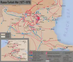 La Guerre d'indépendance roumaine désigne la participation roumaine à la Guerre russo-turque de 1877-1878, à l'issue de laquelle la Principauté de Roumanie, combattant du côté russe, a obtenu de la communauté internationale la reconnaissance de son indépendance vis-à-vis de l'Empire ottoman. Autonomes de facto depuis le XIVe siècle et unies depuis le 5 février 1862, les principautés danubiennes de Moldavie et Valachie n'ont jamais été des provinces ottomanes, mais, étant tributaires du Sultan ottoman (le tribut annuel s'élevant à 914 000 lei), n'étaient pas reconnues comme États souverains. Elles avaient toutefois leurs propres lois, princes et armées, et leur propre politique étrangère[8]. Le 16 avril 1877, la Principauté de Roumanie et l'Empire russe signent à Bucarest un traité selon lequel les troupes roumaines combattront aux côtés des troupes russes, autorisées à traverser le territoire roumain, sous condition que la Russie respecte l'intégrité territoriale de la Roumanie.
