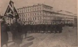 Tout cela a conduit à la Révolution d'Octobre à Petrograd, qui s'est rapidement propagée dans tout l'empire. Le soulèvement de Kiev en novembre 1917 a conduit à la défaite des forces de la République russe dans la capitale. Peu de temps après, la Rada centrale a pris le pouvoir à Kiev, tandis que fin décembre 1917, les bolcheviks ont créé une république ukrainienne rivale dans la ville orientale de Kharkov (ukrainien : Kharkiv), initialement appelée "République populaire ukrainienne". Les hostilités contre le gouvernement de la Rada centrale à Kiev ont commencé immédiatement. Dans ces circonstances, la Rada a déclaré l'indépendance de l'Ukraine (en) le 22 janvier 1918 et a rompu les liens avec la Russie. Comme dans le cas des pays baltes, l'indépendance de la République populaire ukrainienne n'a pas été reconnue par le nouveau gouvernement soviétique de Russie.