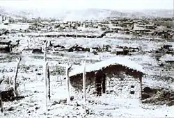 L’on parvenait, mettant en œuvre des moyens rudimentaires de construction, à bâtir jusqu’à douze maisonnettes par jour. L’agglomération, mélange chaotique de masures de fortune bâties au hasard avec des façades tournées de tous côtés, dépourvue de tout ordonnancement, se présentait comme un dédale inextricable de venelles fort étroites et tortueuses menant partout et tenant lieu de réseau de rues. Il n’y avait qu’une seule rue, au sens conventionnel du terme, dans le nord-ouest de l’agglomération. Les maisons, faites en pisé et se composant de trois pièces minuscules, et la plupart du temps aussi d’une cave, étaient chacune entourées de clôtures de broméliacées et d’un fossé, et pouvaient donc, en cas de besoin, faire fonction de réduit de défense. De plus, beaucoup de maisons étaient reliées entre elles par des tunnels souterrains, qui ont pu servir de casemates pendant le conflit[98]. Ces constructions, dont les murs étaient passés à la chaux et les toitures couvertes de plâtre, s’échelonnaient le long des chemins, puis s’éparpillaient sur les monts environnants. L’emplacement le plus bas de la ville était la place de l’église, qui jouxtait la rivière. De là, la ville s’étendait en montant, vers le nord et l’est. Enfin, la ville était cernée, dans toutes les directions, d’une couronne de tranchées creusées à même le sol, dissimulées par la végétation ; ces tranchées étaient appelées à jouer un rôle important lors des assauts successifs de l’armée républicaine.