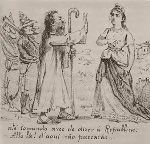 Bien que de doctrine orthodoxe, il marqua son opposition à la hiérarchie de l’Église catholique romaine, qui avait selon lui terni la gloire de l’Église et faisait allégeance au démon, et vint, par ses prédications, à faire de l’ombre aux capucins ambulants des missions catholiques. Plus précisément, Conselheiro, comme du reste la majorité du clergé campagnard local, se rebiffait contre les tentatives entreprises par l’Église de restaurer l’autorité du Vatican, craignant que les campagnes visant à introduire la néo-orthodoxie dans le sertão fussent dommageables à la tradition locale et à l’autonomie des paroisses rurales[81]. Il pensait que la monarchie était une émanation de Dieu et que la république fraîchement proclamée, instituant la séparation de l’Église et de l’État et le mariage civil, était moralement répréhensible et appelée à ruiner le pays et la famille, représentant donc une sorte de nouvel Antéchrist. Il intensifia sa critique politique et sut ainsi, autour de ces positions, rallier à lui tout le mouvement social, exacerbant jusqu’à la terreur hystérique la nervosité générale qui régnait chez les grands propriétaires terriens, les ecclésiastiques et les autorités gouvernementales.
