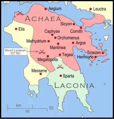 Pendant ce temps, Ptolémée III, allié à la Ligue achéenne lors des guerres contre la Macédoine, transféra son soutien financier à Sparte. Ptolémée prit la décision après avoir calculé qu'une résurgence de Sparte en ferait une alliée plus utile contre la Macédoine que la Ligue Achéenne sur le déclin[10],[11],[12].