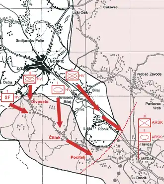 L'opération de la poche de Medak a lieu dans un saillant au sud de Gospić, les 9 et . L'offensive est menée par l'armée croate afin de faire stopper les tirs d'artillerie serbes dans la région autour de Gospić[175]. L'opération fait reculer l'artillerie serbe mais est entachée par des crimes de guerre. Le TPIY accuse les officiers croates Janko Bobetko (en), Rahim Ademi et Mirko Norac pour des crimes de guerre commis lors de l'offensive[176]. Norac est par la suite reconnu coupable par un tribunal croate[177]. L'opération est arrêtée du fait de la pression internationale et un accord est trouvé dans lequel les troupes croates reviennent à leurs positions antérieures au et le saillant est occupé par les soldats de l'ONU. Les événements qui suivent restent controversés car les autorités canadiennes ont avancé que l'armée croate a affronté de manière intermittente les troupes canadiennes du Princess Patricia's Canadian Light Infantry qui se déployaient dans le saillant[178]. Les témoignages du ministre de la défense croate et des officiers des Nations unies lors du procès Ademi-Norac nient que la bataille ait eu lieu[179],[180],[181],[182].
