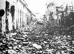 Destructions dans la rue principale de Dubrovnik (gauche) et carte des tirs d'artillerie dans la ville fortifiée (droite) | ||