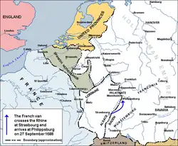 Le maréchal Duras et Vauban, avec 30 000 hommes sous le commandement nominal du Dauphin, assiègent la forteresse de Philippsburg, située dans l'électorat de Trèves, du au . Elle tombe après une âpre lutte[38]. L'armée française continue vers Mannheim qui tombe le , puis vers Frankenthal. D'autres villes tombent sans résistance comme Oppenheim, Worms, Bingen, Kaiserslautern, Heidelberg, Spire et surtout la stratégique forteresse de Mayence. Après que Coblence eut refusé de se rendre, Boufflers la soumet à un intense bombardement qui provoque de gros dégâts mais ne fait pas tomber la ville[38].