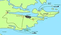 L'Operación Rosario[19] débute au soir du jeudi , lorsque la frégate argentine ARA Santísima Trinidad (D-2) (en) de la Task Force 40 s'arrête à 500 mètres de Mullet Creek (en) au sud de Stanley et débarque une unité de forces spéciales de la marine argentine (Agrupación de Buzos Tácticos) pour l'occuper.