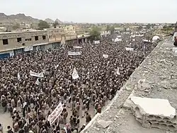 En mars 2011, dans le sillage des contestations dans le monde arabe et des protestations yéménites de 2011, des combats ont fait une vingtaine de morts lorsque des rebelles chiites ont pris le contrôle d'une installation militaire lors de combats contre des combattants pro-gouvernementaux[54]. Les zaïdites prennent le contrôle de plusieurs districts de la province d'Al-Jawf. Le , les rebelles houthistes reprennent le contrôle de Saada, alors qu'un cessez-le-feu avait été proclamé en 2010. Les rebelles bénéficient de la non-intervention de l'armée, commandée dans la région nord-ouest par Ali Mohsen, et qui a lui aussi rejoint la révolution. Ils purgent immédiatement la ville de leurs ennemis, faisant des dizaines de morts, dynamitent les biens immobiliers du cheikh Majali, allié du président Saleh[55].