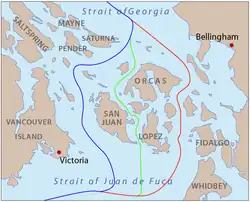 Cependant, il existe en fait deux détroits que l'on pourrait appeler le milieu du chenal : le détroit de Haro, le long du côté ouest des îles San Juan, et le détroit de Rosario, le long du côté est[2].