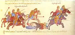 - ↑ Jean Skylitzès considère Sphangel ou Sphengel comme étant le commandant en second suivi de Ikmor alors que Léon le Diacre inverse ces deux positions. Ikmor fut tué au cours d’une bataille devant Dorostolon. On identifie généralement Sphangel avec le Sveneld de la Chronique des temps passés. Les chroniqueurs grecs affirment aussi que Sphangel fut tué à Dorostolon, alors que la Chronique des temps passés affirme que celui-ci survécut à la guerre ainsi qu’à l’embuscade qui suivit et qui couta la vie à Sviatoslav