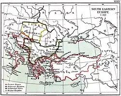 Au début du Xe siècle, deux puissances dominaient les Balkans : l’Empire byzantin contrôlait le sud de la péninsule et la côte, alors que l’Empire bulgare tenait le centre et le nord. Le tsar Siméon (règne 893-927) réussit à étendre son empire au détriment de Byzance grâce à une série de guerres qui lui valurent de voir reconnu son titre impérial[2]. La mort de Siméon en fut bientôt suivie d’un rapprochement entre les deux empires, concrétisé par un traité et le mariage plus tard la même année entre le second fils et successeur de Siméon, Pierre Ier (r. 927-969) et Maria, petite-fille de l’empereur byzantin Romain Ier Lécapène (r. 920-944). Le titre d’empereur fut reconnu à Pierre comme il l’avait été à son père. De plus, les Byzantins s’engagèrent à payer un tribut aux Bulgares dans lequel, pour sauver la face, ils affectèrent de voir une dot[3],[4].