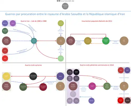 Le conflit par procuration Iran-Arabie Saoudite ou la guerre froide au Moyen-Orient (ou nouvelle guerre froide[3] en français et Iran–Saudi Arabia proxy conflict[4] en anglais) est un concept géopolitique récent faisant référence aux rivalités entre l'Arabie saoudite et ses alliés[Note 1] d'une part et l'Iran et ses alliés[Note 2] d'autre part dans l'histoire contemporaine du Moyen-Orient[Note 3]. Comme la guerre froide qui oppose les États-Unis, l'URSS et leurs alliés respectifs durant la seconde moitié du XXe siècle, il s'agit d'une confrontation menée de manière principalement indirecte entre les deux camps et qui prend diverses formes : rivalités diplomatiques, militaires, économiques, religieuses ou encore culturelles[5]. Les deux États ont rompu leurs relations diplomatiques en 2016 et, dans leur lutte d'influence, ils s'emploient à soutenir des camps rivaux au Moyen-Orient et même au delà[6].