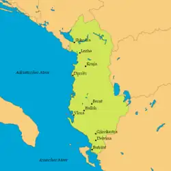 Au printemps 1466, le sultan Mehmed II marche avec son armée contre les Albanais. Sous la direction de leur commandant, Skanderbeg, ils résistent depuis longtemps aux Ottomans et ont demandé à plusieurs reprises l'aide à Venise[4]. Pour les Albanais, le déclenchement de la guerre ottomano-vénitienne offre une chance en or pour réaffirmer leur indépendance ; pour les Vénitiens, ces alliés fournissent une protection utile aux possessions côtières vénitiennes de Durazzo (Durrës) et Scutari (Shkodër ou Shkodra). Le seigneur monténégrin Ivan Crnojević (en), prince de Zeta, joue un rôle important dans la défense de Scutari qui le rend célèbre à Venise. Le principal résultat de cette campagne est la construction de la forteresse d'Elbasan. Cette forteresse située à un emplacement stratégique, dans les basses terres près de l'extrémité de l'ancienne Via Egnatia, coupe l'Albanie en deux, isolant la base de Skanderbeg dans les hautes terres du nord des possessions vénitiennes du sud[23]. Cependant, après le retrait du sultan, Skanderbeg lui-même passe l'hiver en Italie, à la recherche d'aide. À son retour début 1467, ses forces descendent des hautes terres, battent Ballaban Badera et lèvent le siège de la forteresse de Croie (Krujë), et attaquent sans succès Elbasan[24],[25]. Mehmed II répond en marchant à nouveau contre l'Albanie. Il poursuivit énergiquement les attaques contre les forteresses albanaises, tout en envoyant des détachements faire des raids sur les possessions vénitiennes pour les maintenir isolées[21]. Les Ottomans échouent à nouveau à prendre Croie, et ne réussissent pas à soumettre le pays. Cependant, pendant l'hiver se déclare une épidémie de peste qui affaiblit la résistance locale[21]. Skanderbeg meurt de la malaria dans la forteresse vénitienne de Lissus (Lezhë), mettant fin à la capacité de Venise à utiliser les seigneurs albanais pour son propre avantage[23]. Les Albanais sont laissés à eux-mêmes et progressivement soumis au cours de la décennie suivante.