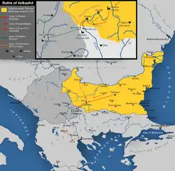 Au début de 811, Nicéphore Ier (r. 802-811) lança une expédition massive contre la Bulgarie, avançant jusqu’à Marcellae (près de l’actuelle Karnobat en Bulgarie). Là, Krum tenta de parlementer le , mais Nicéphore était maintenant déterminé à poursuivre son avance. Son armée parvint à éviter les embuscades tendues dans les passes des montagnes des Balkans et défit une armée de 12 000 hommes qui tentait d’empêcher son avancée en Mésie. Une autre armée de 50 000 hommes, assemblée à la hâte, fut également défaite devant les murs de la capitale bulgare de Pliska qui tomba aux mains de l’empereur le [20]. Là, Nicéphore s’appropria les trésors amassés par Krum, incendia la ville et engagea son armée à massacrer la population. Une nouvelle tentative diplomatique de Krum fut repoussée[21],[16],[19].