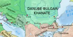 La situation devait se détériorer au VIIIe siècle avec la création du Premier Empire bulgare. L’expansion vers l’ouest du khanat bulgare devait entrainer des migrations massives en Illyrie ; en 762, plus de 200 000 personnes auraient fui en territoire byzantin d’où elles furent relocalisées en Asie mineure[16]. Le khan Telerig (r. 768-777) voulut en 774 recoloniser les territoires désertés et envoya une armée de douze mille hommes s’emparer de la région de Berzétie en Macédoine et transplanter leurs habitants slaves et valaques en Bulgarie. Ayant eu vent ce cette invasion, Višeslav en fit part à l’empereur Constantin V (r. 741-775) [17]. Les Bulgares furent défaits lors de la bataille de Lithosoria en octobre 773.