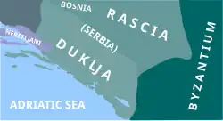 Le premier « État » serbe que l’on appellera au Moyen Âge « Rascie »[N 3] était donc situé au sud de la Serbie moderne et au Monténégro, comprenant les territoires le long des rivières Lim et Piva, l’embouchure de la Neretva (appelée Pagania), Zahumlje, Trebinje et Konavli, avec comme centre l’actuelle Novi Pazar[12].