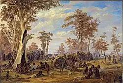 Les réactions des habitants aborigènes à l'invasion soudaine des Britanniques devinrent uniformément hostiles lorsque la présence étrangère conduisit à une compétition pour les ressources et à l'occupation de leurs terres. Les maladies européennes ont décimé les populations autochtones et l'occupation ou la destruction des terres et des ressources alimentaires ont parfois provoqué des famines[26]. Dans l'ensemble, ni les Européens ni les peuples autochtones n'ont abordé le conflit de manière organisée, la « guerre de la frontière » étant davantage un conflit entre des groupes de colonisateurs et des groupes autochtones séparés plutôt qu'une guerre systématique, même si parfois elle impliquait des soldats britanniques et plus tard des unités de police. Tous les Australiens autochtones n'ont pas résisté à l'empiètement européen sur leurs terres ; beaucoup ont également servi dans des unités de police et ont été impliqués dans des attaques contre d'autres tribus[26]. Les colonisateurs ont souvent réagi avec violence, entraînant un certain nombre de massacres aveugles[26] [27]. Les activités européennes qui ont provoqué des conflits importants sont notamment le squat pastoral (l'annexion de pâturages, voir Squatting (Australian history) (en)) et les ruées vers l'or en Australie.