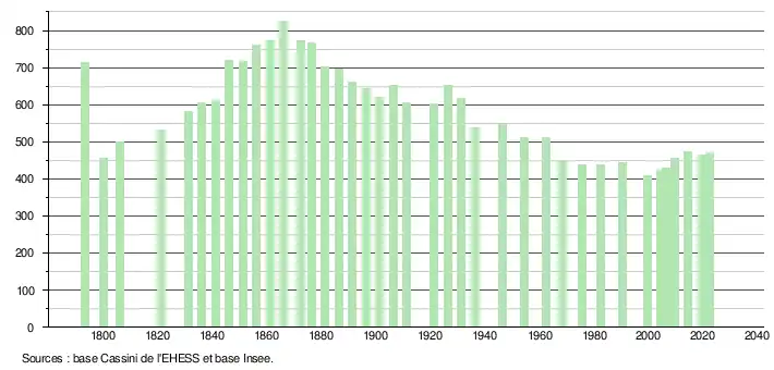 L'évolution du nombre d'habitants est connue à travers les recensements de la population effectués dans la commune depuis 1793. Pour les communes de moins de 10 000 habitants, une enquête de recensement portant sur toute la population est réalisée tous les cinq ans, les populations de référence des années intermédiaires étant quant à elles estimées par interpolation ou extrapolation[20]. Pour la commune, le premier recensement exhaustif entrant dans le cadre du nouveau dispositif a été réalisé en 2004[21].
