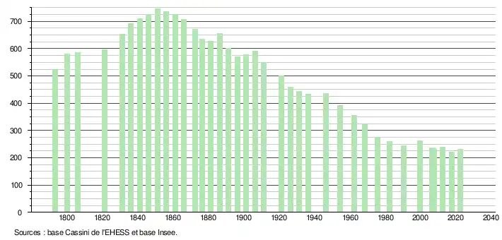 L'évolution du nombre d'habitants est connue à travers les recensements de la population effectués dans la commune depuis 1793. Pour les communes de moins de 10 000 habitants, une enquête de recensement portant sur toute la population est réalisée tous les cinq ans, les populations de référence des années intermédiaires étant quant à elles estimées par interpolation ou extrapolation[21]. Pour la commune, le premier recensement exhaustif entrant dans le cadre du nouveau dispositif a été réalisé en 2007[22].