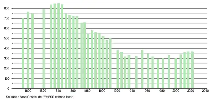 L'évolution du nombre d'habitants est connue à travers les recensements de la population effectués dans la commune depuis 1793. Pour les communes de moins de 10 000 habitants, une enquête de recensement portant sur toute la population est réalisée tous les cinq ans, les populations de référence des années intermédiaires étant quant à elles estimées par interpolation ou extrapolation[19]. Pour la commune, le premier recensement exhaustif entrant dans le cadre du nouveau dispositif a été réalisé en 2006[20].