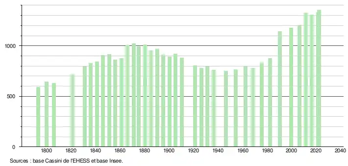 L'évolution du nombre d'habitants est connue à travers les recensements de la population effectués dans la commune depuis 1793. Pour les communes de moins de 10 000 habitants, une enquête de recensement portant sur toute la population est réalisée tous les cinq ans, les populations de référence des années intermédiaires étant quant à elles estimées par interpolation ou extrapolation[27]. Pour la commune, le premier recensement exhaustif entrant dans le cadre du nouveau dispositif a été réalisé en 2006[28].