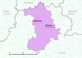 La loi portant nouvelle organisation territoriale de la République (dite loi NOTRe) du vise une réduction du nombre d'intercommunalités en France en faisant passer le seuil démographique minimal de 5 000 à 15 000 habitants, sauf exceptions. Le schéma départemental de coopération intercommunale du Loiret est arrêté sur ces bases le et le nombre d'établissements publics de coopération intercommunale à fiscalité propre passe dans le département du Loiret de 28 (2 communautés d'agglomération et 26 communautés de communes) à 16 (deux communautés d'agglomération et 14 communautés de communes dont une interdépartementale)[42]. Les communautés de communes de Beauce et du Gâtinais, du Cœur du Pithiverais et du Plateau Beauceron fusionnent ainsi à compter du en une seule entité : la communauté de communes du Pithiverais, dont le siège est à Pithiviers. Cette nouvelle intercommunalité comprend 31 communes dont Guigneville[43].