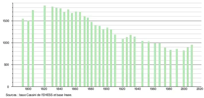 - ↑ Dans le tableau des recensements et le graphique, par convention dans Wikipédia, le principe a été retenu, pour les populations légales postérieures à 1999 de n’afficher dans le tableau des recensements et le graphique que les populations correspondant à l'année 2006, première population légale publiée calculée conformément aux concepts définis dans le décret no 2003-485 du 5 juin 2003, et les années correspondant à une enquête exhaustive de recensement pour les communes de moins de 10 000 habitants, ainsi que la dernière population légale publiée par l’Insee.