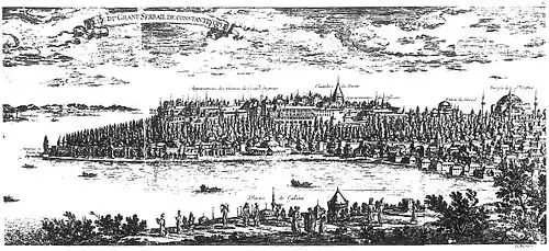 - ↑ Lire sur Gallica : Relation nouvelle d'un voyage de Constantinople. Enrichie de plans levez par l'auteur sur les lieux, et des figures de tout ce qu'il y a de plus remarquable dans cette ville. Présentée au Roy., à Paris, en la boutique de Pierre Rocolet. Chez la veuve de Damien Foucault, impr. & libr. ordin. du roy & de la ville, au Palais en la galerie des Prisonniers, aux Armes du Roy et de la Ville. M.DC.LXXX [1680]. Réédité en 1681, 1689 et suiv.