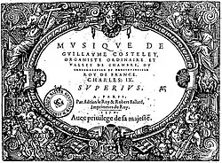 - Musique de Guillaume Costeley, organiste ordinaire et vallet de chambre du treschrestien et tresinvincible roy de France Charles IX. Paris : Adrian Le Roy et Robert Ballard, 1570. 5 vol. 4° oblong. RISM C 4229, Lesure 1955 n° 139.