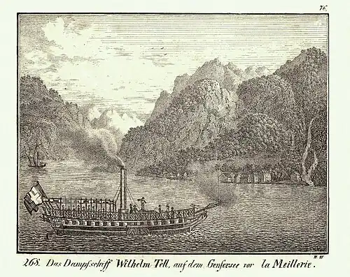 Une autre gravure représente Guillaume Tell devant Meillerie. L'aspect général et certains détails sont très ressemblants à la gravure décrite ci-dessus, dont le grand drapeau suisse. L'arrière plan montre les Alpes et un voilier sur le lac. L’inscription est en allemand : « 268. Das Dampfschiff Wilhelm Tell, auf dem Genfersee vor la Meillerie » (Le bateau à vapeur Guillaume Tell, sur le lac Léman devant Meillerie)[19]
