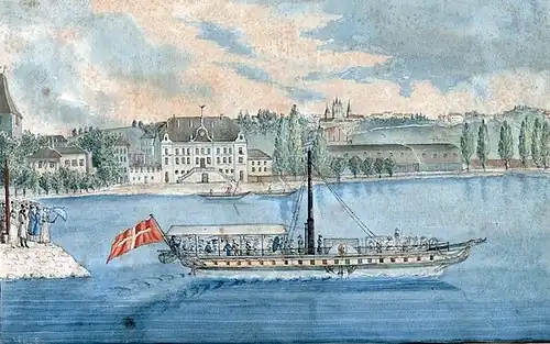 Une autre version de cette gravure, coloriée, diffère par ses couleurs vives et quelques aspects : le drapeau est aux couleurs de Genève, des toiles sont placées à l’avant comme à l'arrière, la ville de Genève en arrière plan est beaucoup plus visible et reconnaissable, ainsi que de nombreux détails comme la rambarde ou le moins grand nombre de hublots dans la coque (15 au lieu de 17)[1].