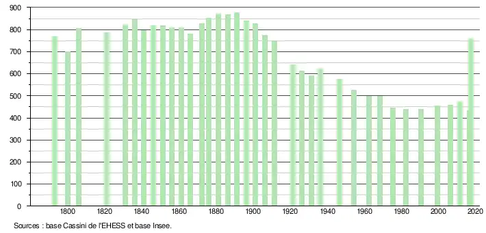 L'évolution du nombre d'habitants est connue à travers les recensements de la population effectués dans la commune depuis 1793. Pour les communes de moins de 10 000 habitants, une enquête de recensement portant sur toute la population est réalisée tous les cinq ans, les populations de référence des années intermédiaires étant quant à elles estimées par interpolation ou extrapolation[4]. Pour la commune, le premier recensement exhaustif entrant dans le cadre du nouveau dispositif a été réalisé en 2006[5].