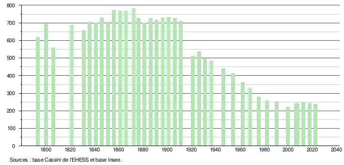 L'évolution du nombre d'habitants est connue à travers les recensements de la population effectués dans la commune depuis 1793. Pour les communes de moins de 10 000 habitants, une enquête de recensement portant sur toute la population est réalisée tous les cinq ans, les populations de référence des années intermédiaires étant quant à elles estimées par interpolation ou extrapolation[30]. Pour la commune, le premier recensement exhaustif entrant dans le cadre du nouveau dispositif a été réalisé en 2007[31].
