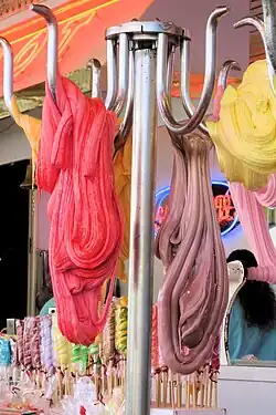- « Et le fabricant de pâte de guimauve, allongeant, tordant en gigantesques anneaux la pâte blanche qui sent l'amande ! (A. Daudet, Les Rois en exil, 1879, p. 232). »