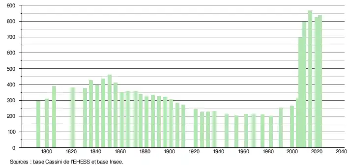 | L'évolution du nombre d'habitants est connue à travers les recensements de la population effectués dans la commune depuis 1793. Pour les communes de moins de 10 000 habitants, une enquête de recensement portant sur toute la population est réalisée tous les cinq ans, les populations de référence des années intermédiaires étant quant à elles estimées par interpolation ou extrapolation[38]. Pour la commune, le premier recensement exhaustif entrant dans le cadre du nouveau dispositif a été réalisé en 2004[39]. En 2022, la commune comptait 835 habitants[Note 8], en évolution de −5,76 % par rapport à 2016 (Tarn : +2,52 %, France hors Mayotte : +2,11 %). |