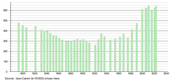 L'évolution du nombre d'habitants est connue à travers les recensements de la population effectués dans la commune depuis 1793. Pour les communes de moins de 10 000 habitants, une enquête de recensement portant sur toute la population est réalisée tous les cinq ans, les populations de référence des années intermédiaires étant quant à elles estimées par interpolation ou extrapolation[22]. Pour la commune, le premier recensement exhaustif entrant dans le cadre du nouveau dispositif a été réalisé en 2005[23].