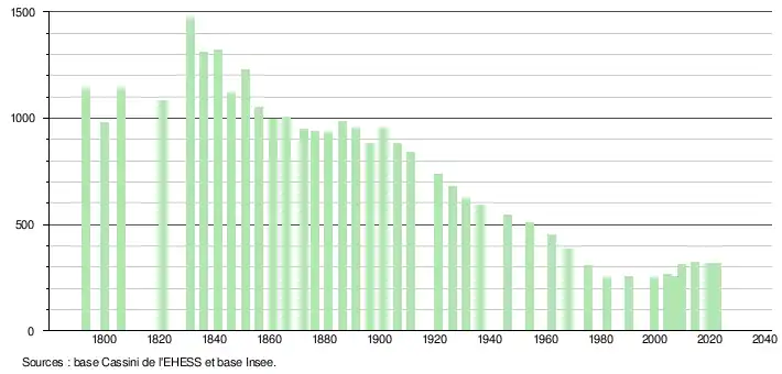 L'évolution du nombre d'habitants est connue à travers les recensements de la population effectués dans la commune depuis 1793. Pour les communes de moins de 10 000 habitants, une enquête de recensement portant sur toute la population est réalisée tous les cinq ans, les populations de référence des années intermédiaires étant quant à elles estimées par interpolation ou extrapolation[14]. Pour la commune, le premier recensement exhaustif entrant dans le cadre du nouveau dispositif a été réalisé en 2004[15].